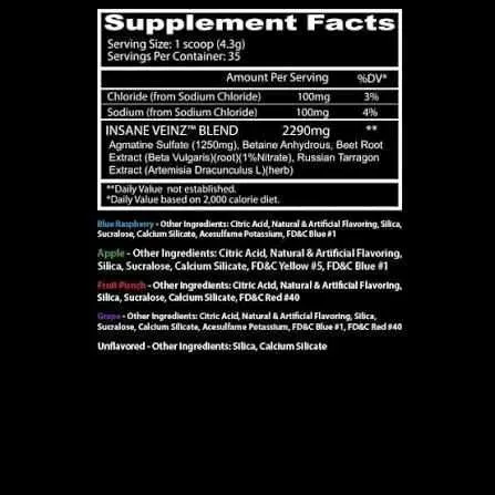 Insane Veinz es un pre-entreno sin cafeína ni estimulantes, diseñado para aumentar la vascularidad, el bombeo muscular y el flujo sanguíneo durante el entrenamiento. Contiene agmatina, betaína, extracto de remolacha y estragón ruso, ingredientes que favorecen la producción de óxido nítrico y mejoran...