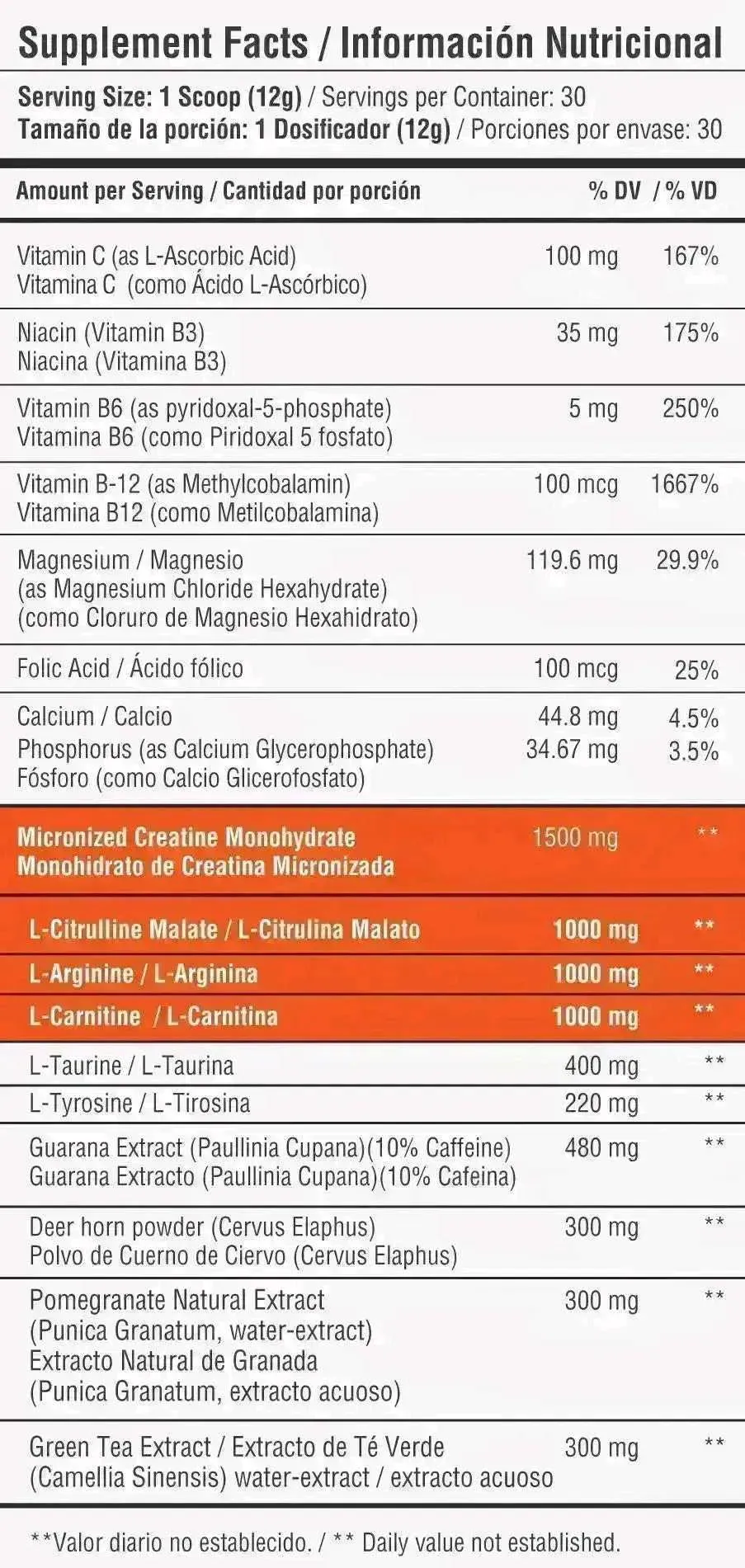 Nuclear de Healthy Sports es un pre-entrenamiento que combina cafeína y arginina para aumentar la energía, fuerza, concentración y resistencia durante el ejercicio. Ayuda a mejorar el rendimiento, retrasar la fatiga y potenciar la vasodilatación muscular, ideal para entrenamientos intensos.